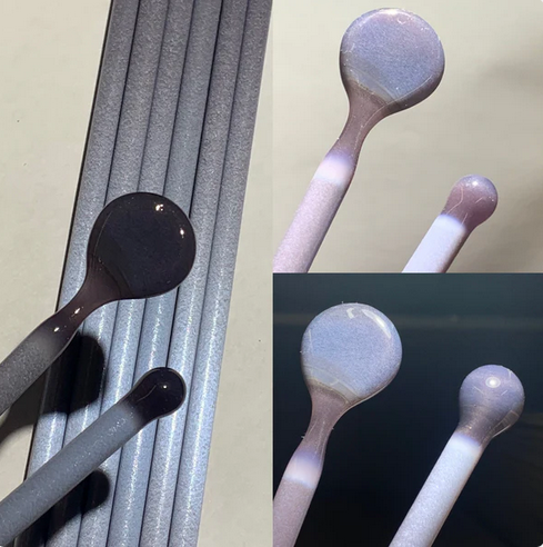 Pleasing variety of Wildberry with a nice satin content. Mostly translucent color that will appear closer to opaque if kept thick, and more transparent if thinned or stretched.